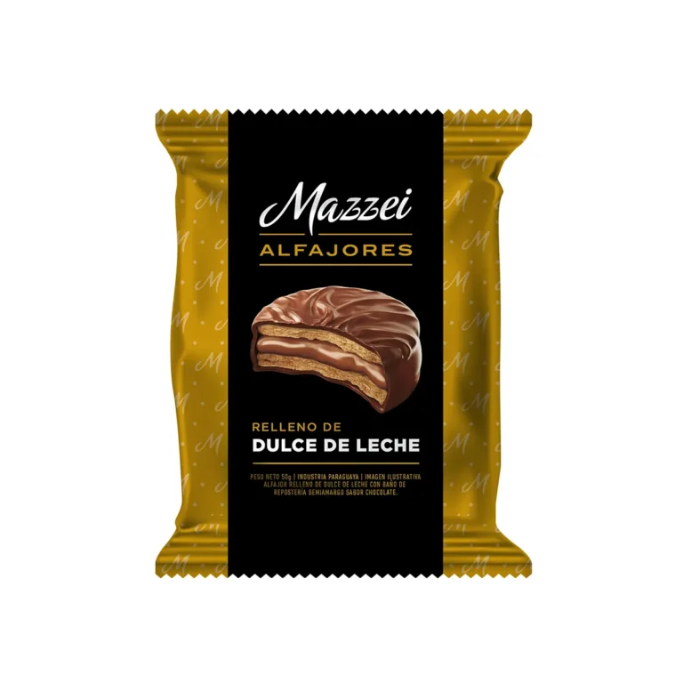 El Alfajor Premium Baño Negro de Mazzei es un alfajor tradicional con cobertura de chocolate oscuro (baño negro) de la